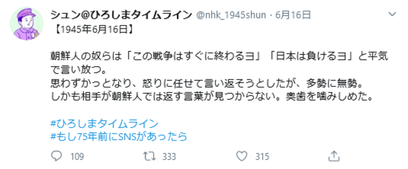 広島から秩父へと避難する途上、【1945年8月20日】付の「朝鮮人だ!!」ツイートで一躍炎上をキメたシュン@ひろしまタイムライン(@nhk_1945shun)。さて11月13~15日の帰路はどうさばくのかと、出典マニアの図書館大好きおじさんはうっすら注目しておりました。