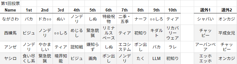 第1回投票での通過基準「10位スコアの80%以上」に則り、最終の決選投票には13語が進みました。投票の結果、うち「○○しろ」「境界知能」「やかましい」の3語が惜しくもトップ10圏外となりました。いわばリアルな選外です。
