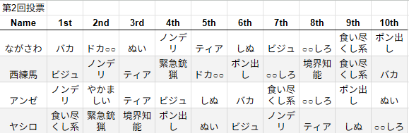 といった具合に、アツい支持が「一部」すぎても残れないわけです。ここらのレギュレーションがいいあんばいに機能している証左で、投票結果を集計しながらひとりニヤついてました。