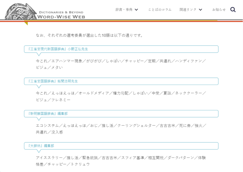三省堂 辞書を編む人が選ぶ「今年の新語」(以下「今年の新語」)は、2020年以降「それぞれの選考委員が選出した10語」を公式サイト上で公開しています。